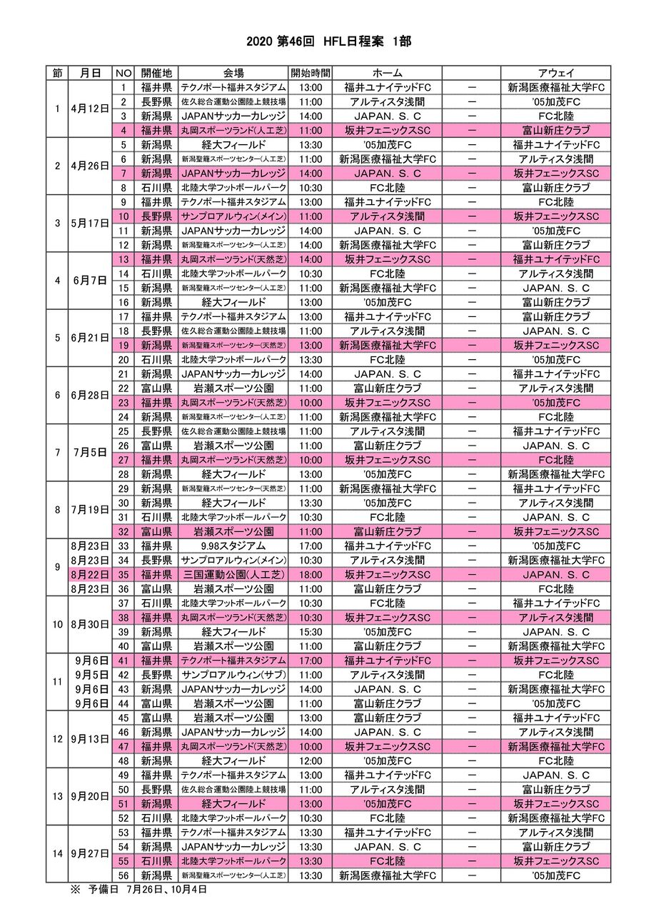 第46回北信越フットボールリーグ日程変更について