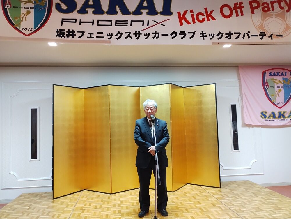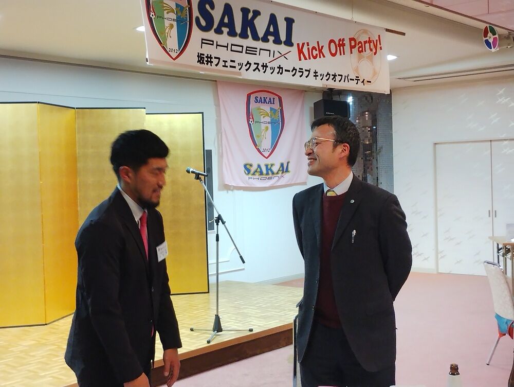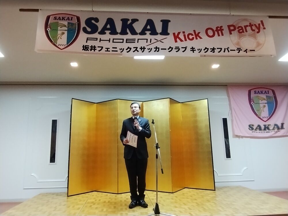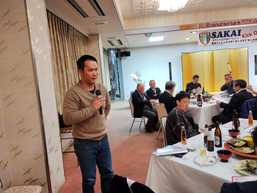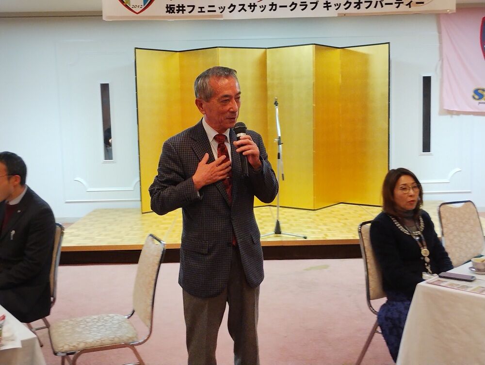 会場には、坂井市副市長 斎野秀幸 様、坂井市サッカー協会長 佐藤岳之 様をはじめ、地域選出の県会議員の皆さま、坂井市議会議員の皆さま、坂井フェニックス後援会の皆さま、チームスポンサーの皆さまにご来場いただき、和やかな雰囲気の中“熱い”応援の言葉をいただきました。