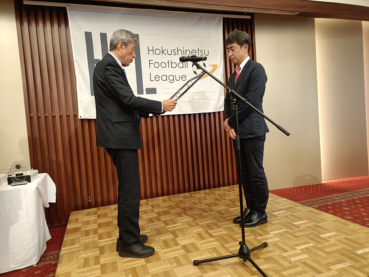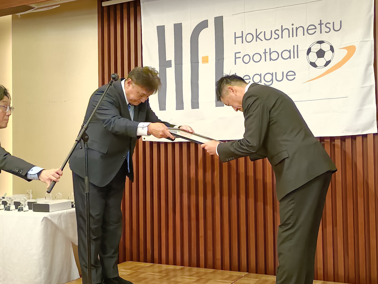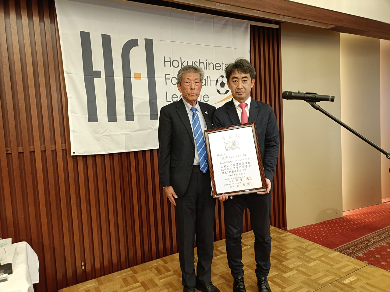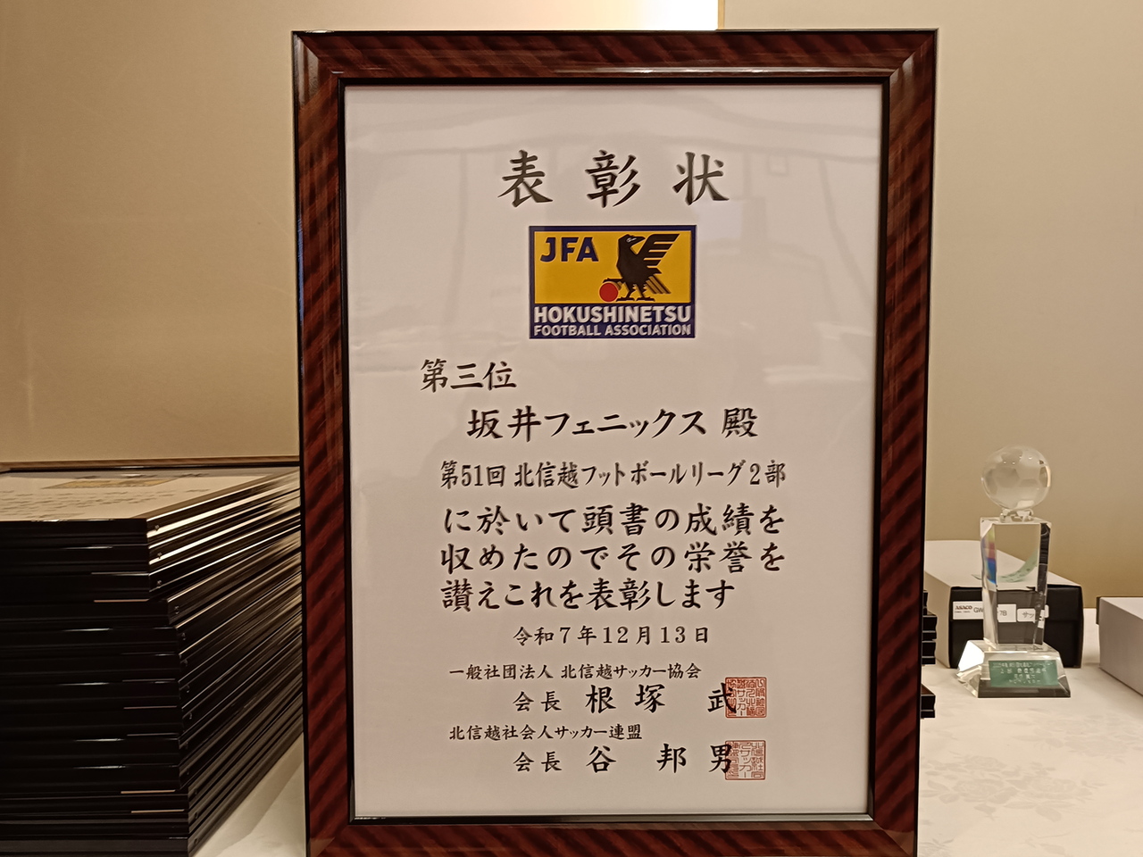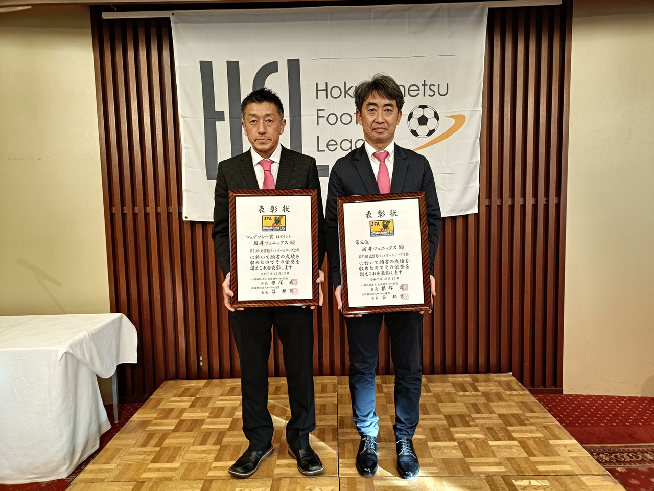 2025年12月13日 北信越フットボールリーグ2025表彰式 日頃より坂井フェニックスサッカークラブを応援していただきありがとうございます。本日12月13日 第51回北信越フットボールリーグ2025表彰式が、富山県電気ビルにて開催され、弊クラブから、東代表・花岡監督が出席しました。今シーズンは、チーム表彰として、・2部リーグ3位・2部リーグフェアプレー賞 を受賞しました。来シーズンは、さらに上位のチーム表彰と、1人でも多くの個人表彰を受賞できるようにチーム一丸で頑張っていきます。Photo gallery 「日記」カテゴリの最新記事 < 前の記事次の記事 >