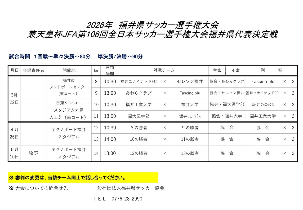昨年10月12日に開幕した、2026年福井県サッカー選手権大会 兼 天皇杯JFA第106回全日本サッカー選手権大会福井県代表決定戦は2回戦までが終了し、このたび準々決勝から決勝までの日程が発表されましたのでお知らせします。